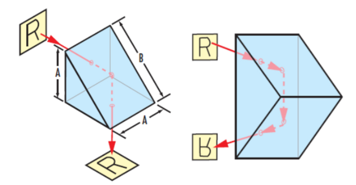 直角棱镜是一种采用90°度概念设计而成的棱镜。直角棱镜可产生翻转或回转的左旋性图像,这取决于棱镜的方向。将两个直角棱镜结合在一起也可以合成图像、偏移光束。并适合用于一些需要位置转折90°或者180°的场合。